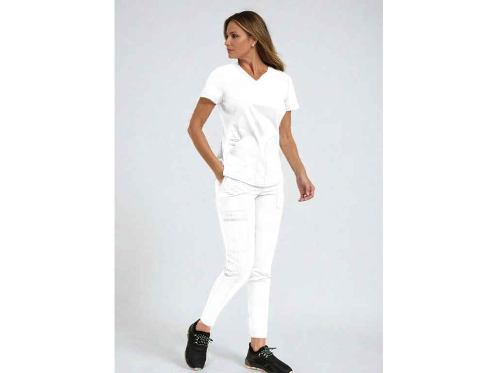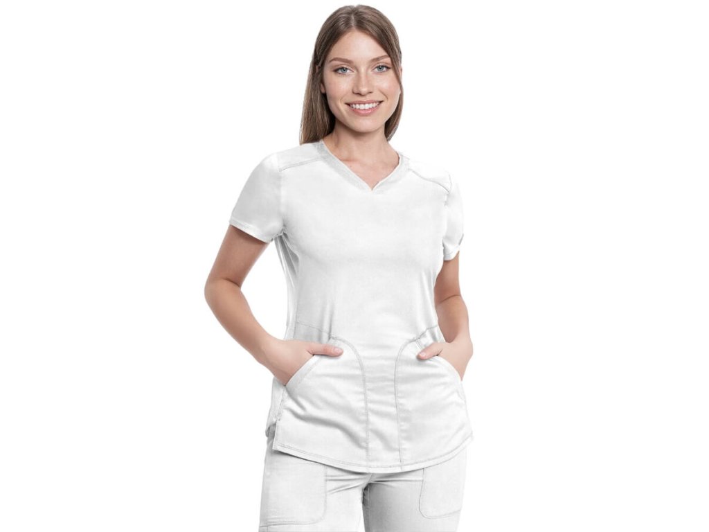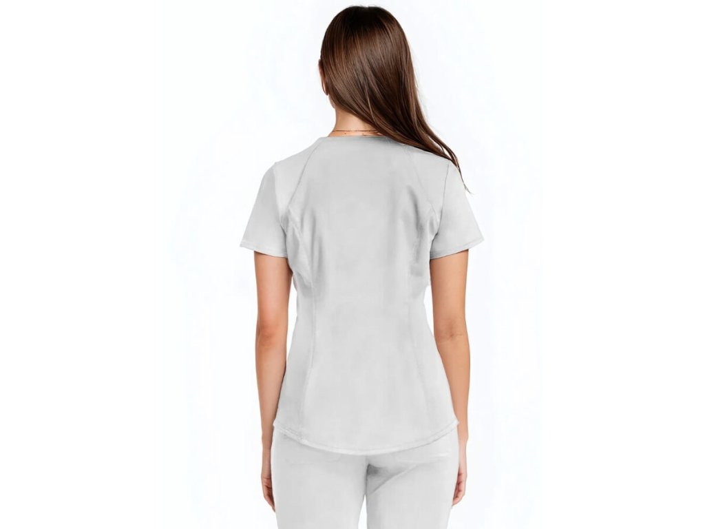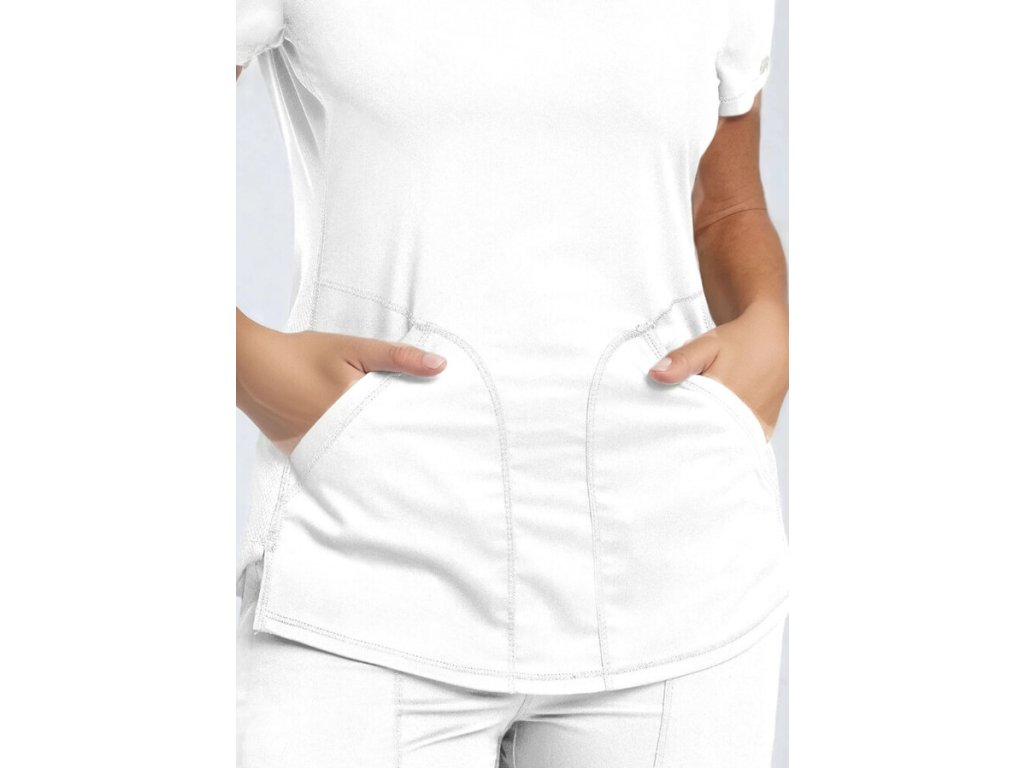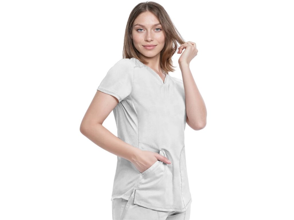 Táto biela zdravotnícka blúza z kolekcie Cherokee Revolution je stvorená pre ženy, ktoré chcú vyzerať štýlovo, cítiť sa komfortne a zároveň pôsobiť sebaisto počas celého dňa. Vďaka modernému strihu „Active Styling“ dokonale kopíruje ženskú siluetu a zároveň poskytuje neobmedzený pohyb.