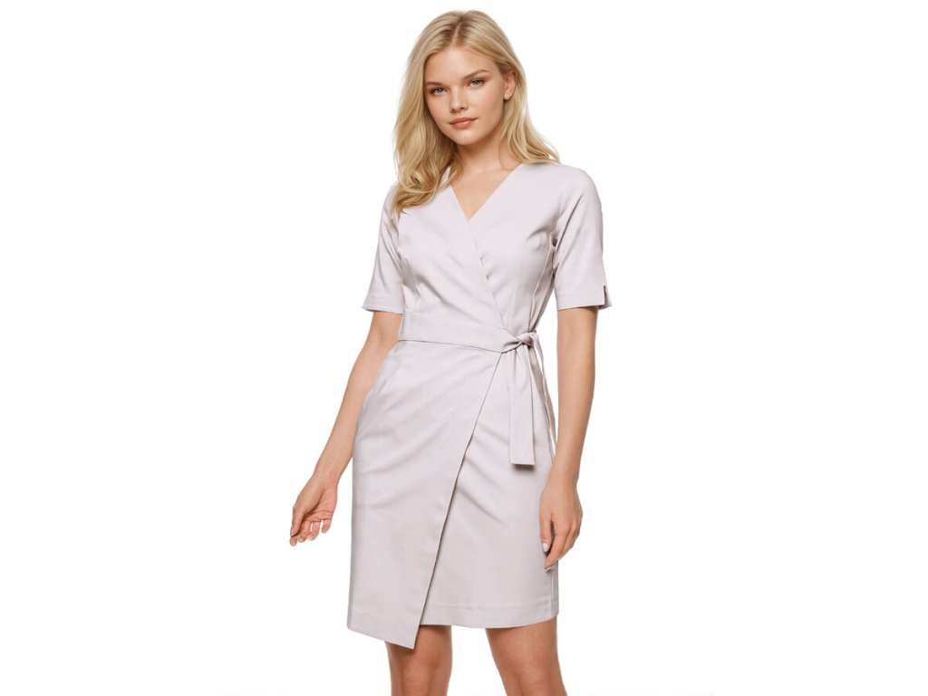 Výstrih zdravotníckych šiat je navrhnutý tak, aby zabezpečil optimálne padnutie a vyvažoval eleganciu s praktickosťou. Rukávy s efektným zakončením opticky vytvarujú vaše paže. Zdravotnícke šaty majú dĺžku nad kolená a sú asymetricky ukončené.