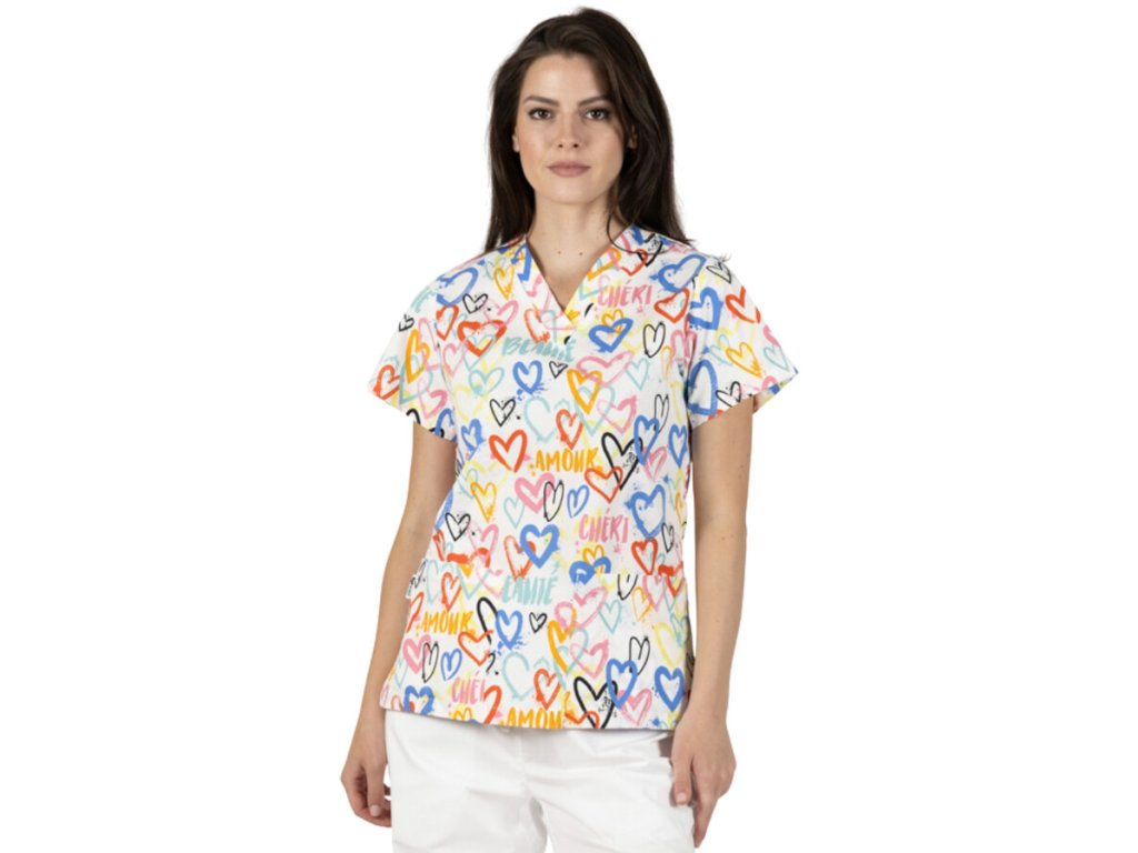 Obľúbenosť si získala vďaka veselým potlačiam, príjemným materiálom, pohodliu a prijateľnej cene. Zdravotná blúzka v mierne vypasovanom strihu a s potlačou rozžiari každé zdravotnícke prostredie a zabezpečí vám pohodlie počas celého pracovného dňa. Je vyrobená z obľúbenej kombinácie materiálov 97 % bavlny a 3 % elastanu, ktorá zaručuje voľnosť a pohodlie pri obliekaní, pohybe a bežnom nosení.