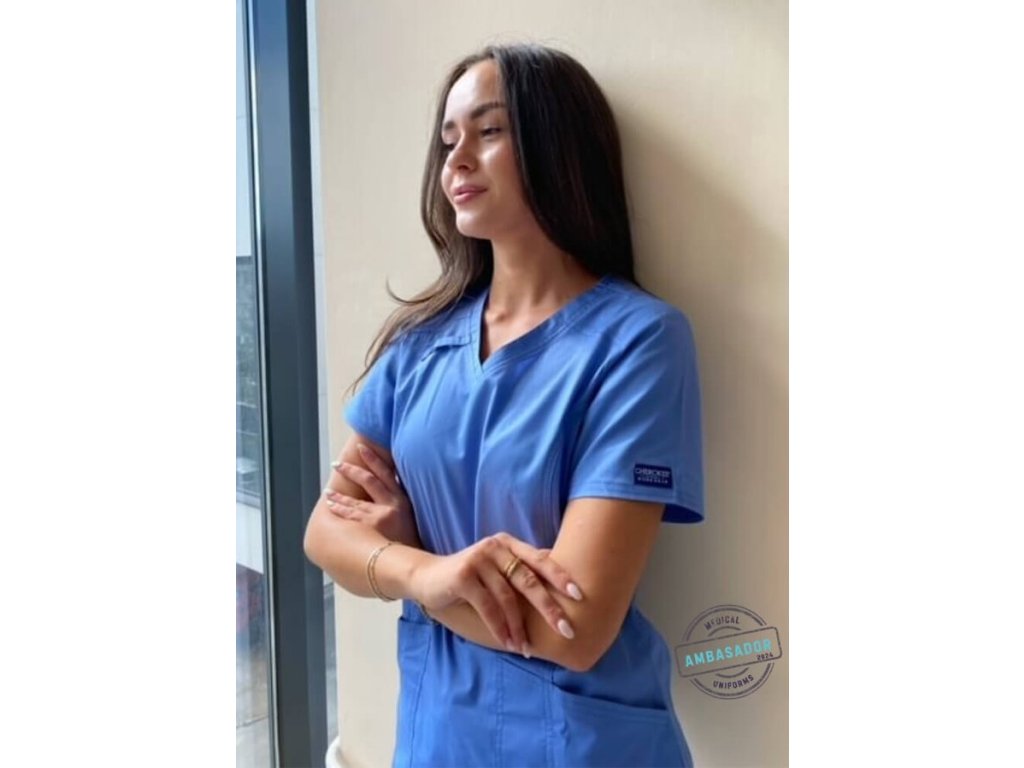Štýlová zdravotnícka blúza s V výstrihom v čisto nebesky modrej farbe. 3 praktické predné vrecká, extra zadné vrecko, pútko na fonendoskop, vystužené miesto na ID kartu, prešitie na pero a dvojité švy. Pohodlný strih, bočné rozparky – ideálna do každodennej praxe.