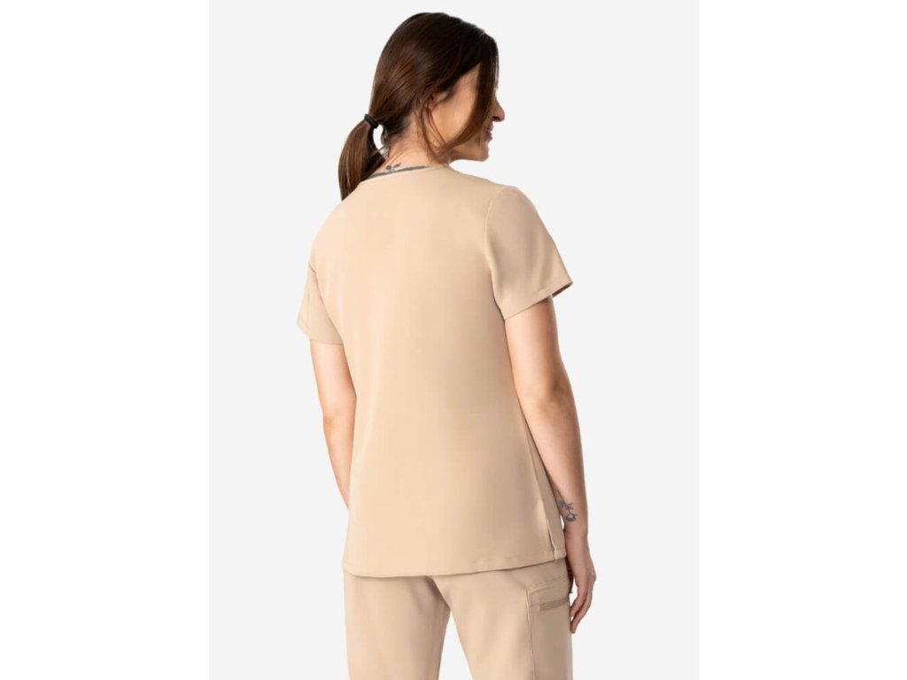 Klasický strih s výstrihom do V a krátkymi rukávmi v modernom štýle. Elegantný vzhľad umocňuje mierne vypasovaný strih, ktorý opticky vylepší postavu zdravotníčky. Na prednej strane zdravotníckej blúzky sú dve vrecká na bokoch a jedno náprsné, ktoré poskytujú dostatok miesta na uloženie potrebných doplnkov, ako sú perá, poznámkové bloky alebo kľúče. Vďaka nim máte všetko, čo potrebujete na prácu, vždy po ruke. Navyše je na pravom ramene našité pútko na visačku. Rozparky na bokoch sa postarajú a voľnejší pohyb. Lekárska blúza je dostupná v krásnych moderných farbách, je štýlová a navyše v nej budete vyzerať elegantne a zároveň profesionálne.