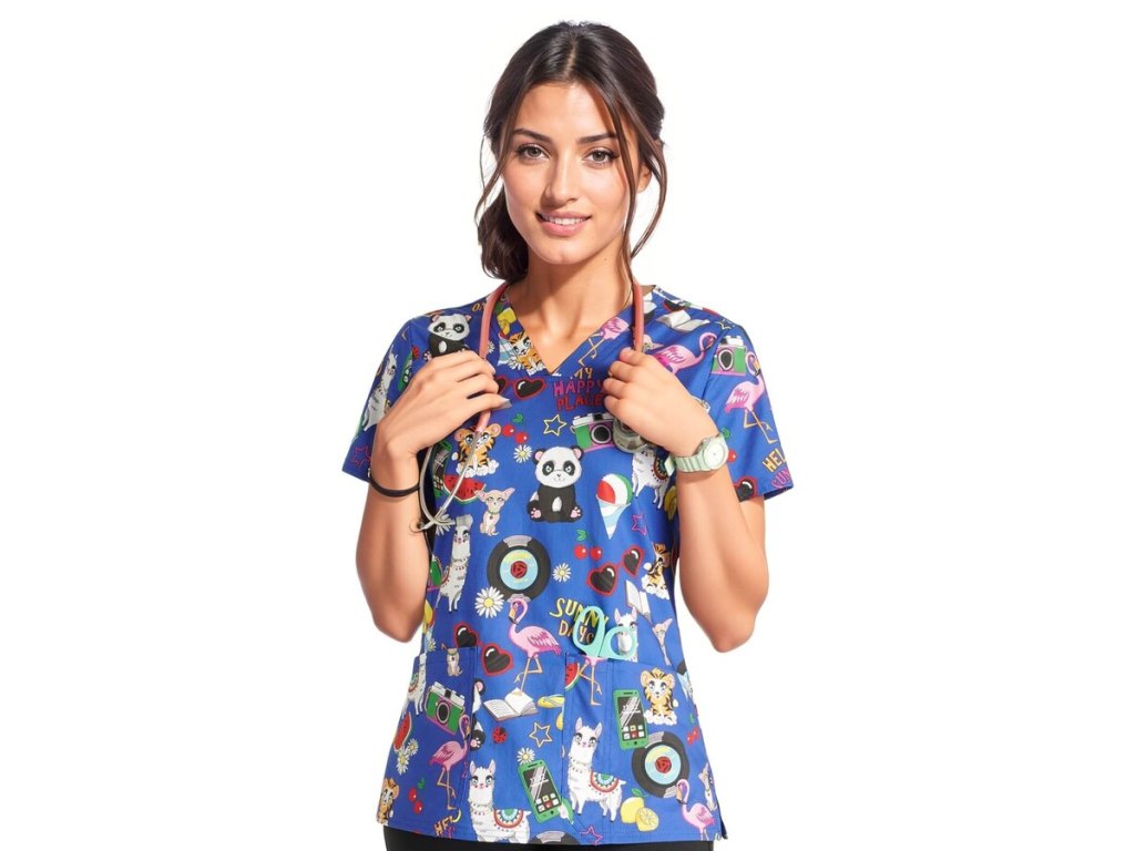 Dámska zdravotnícka blúza s detským motívom patrí do obľúbených typov s potlačou. Poteší vás bavlnený materiál s elastanom.